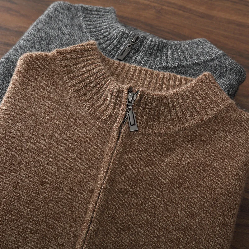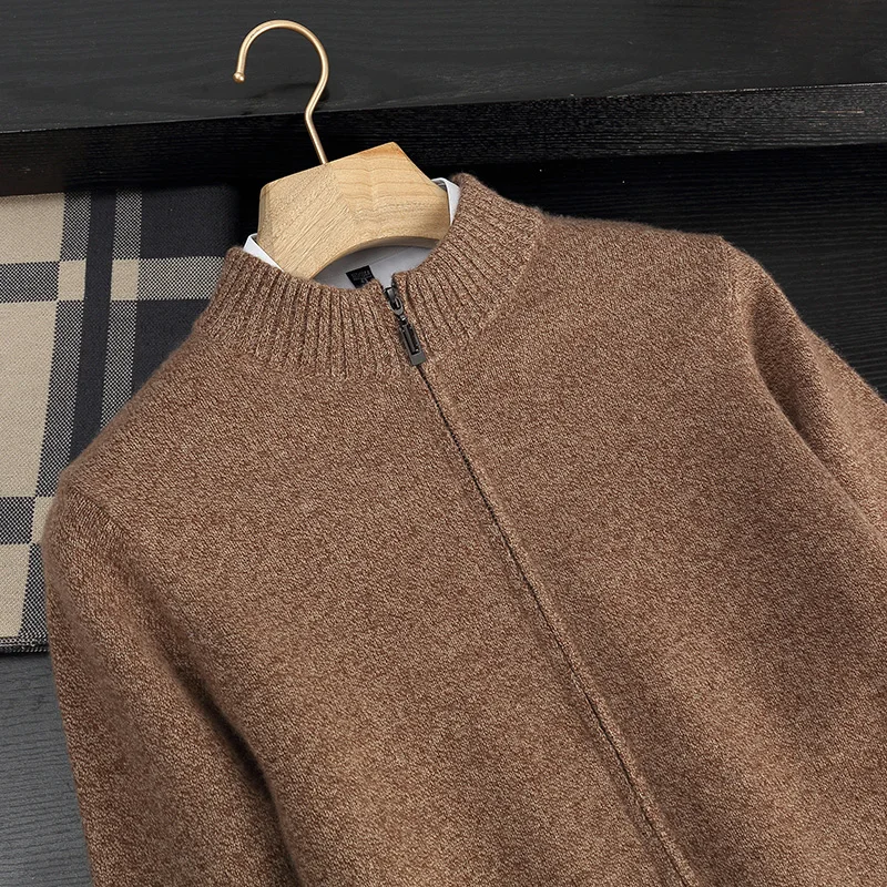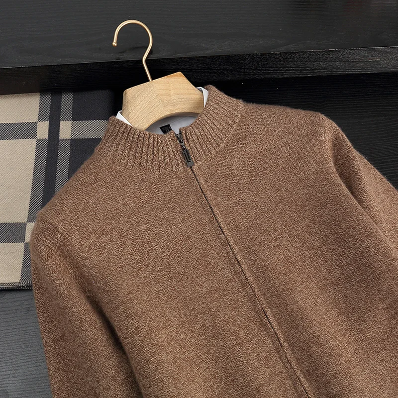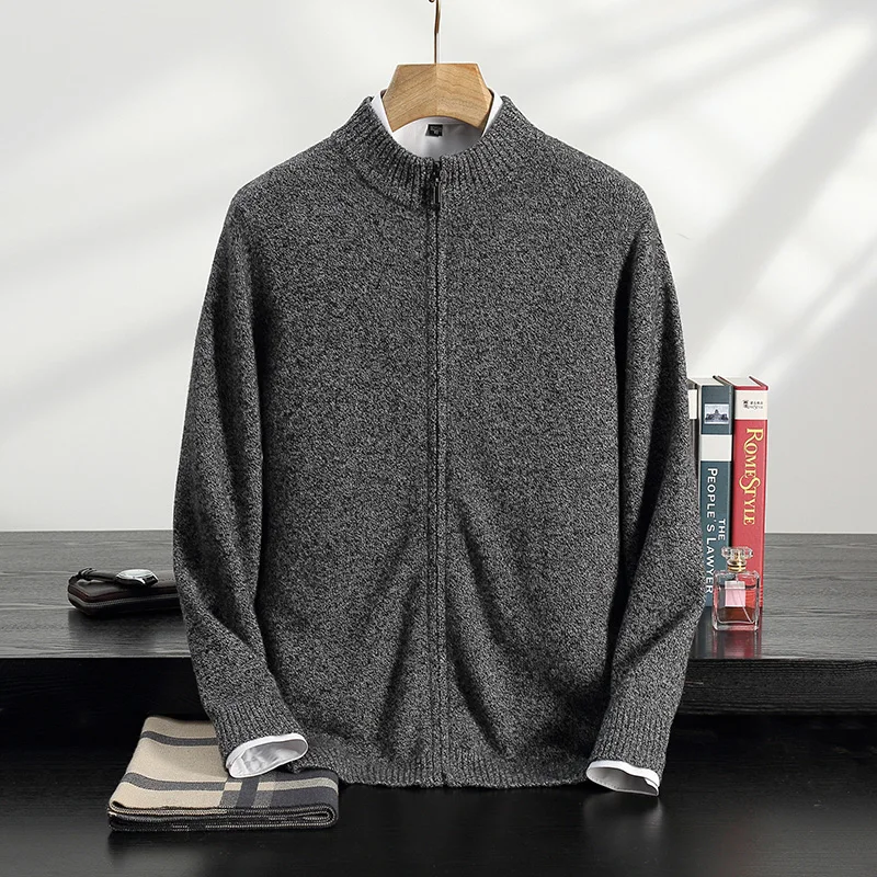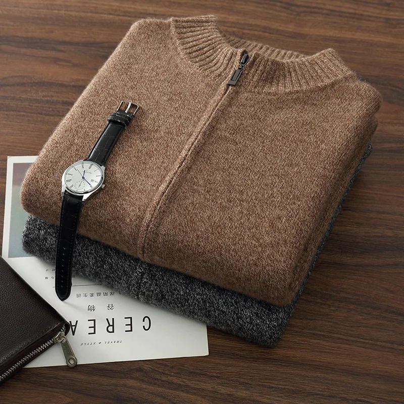 Lyxig herrtröja i 100 % kashmir med hög halsringning, långärmad dragkedja, kofta, vintertjock kappa, smart casual, stickade toppar i kashmir