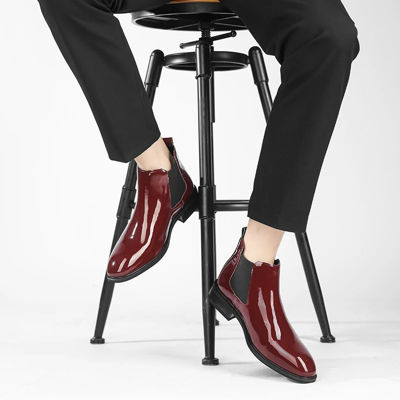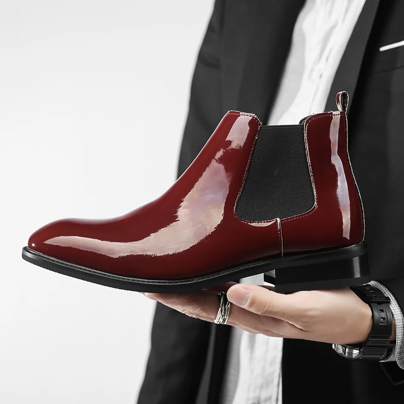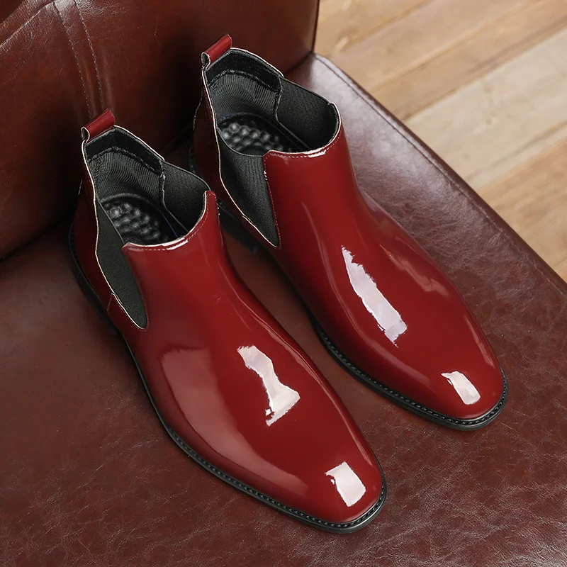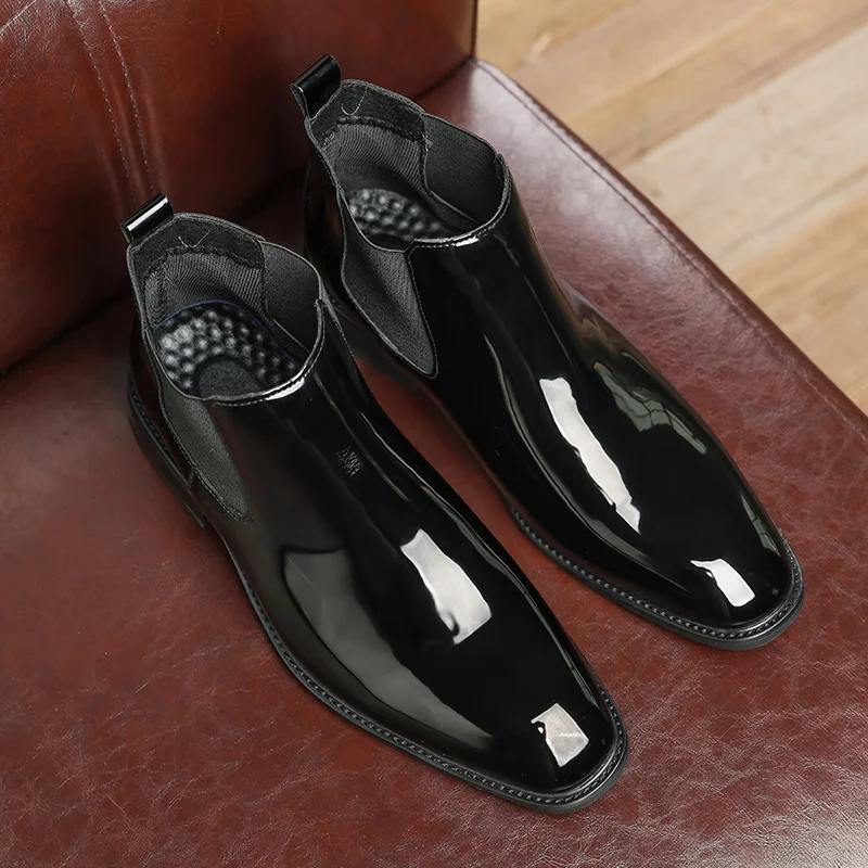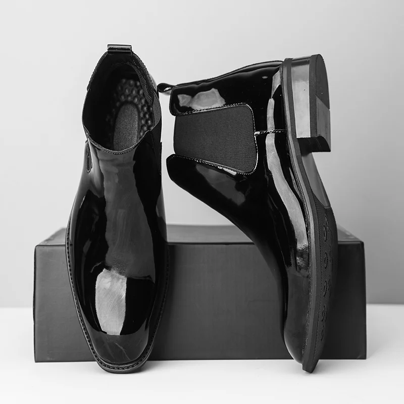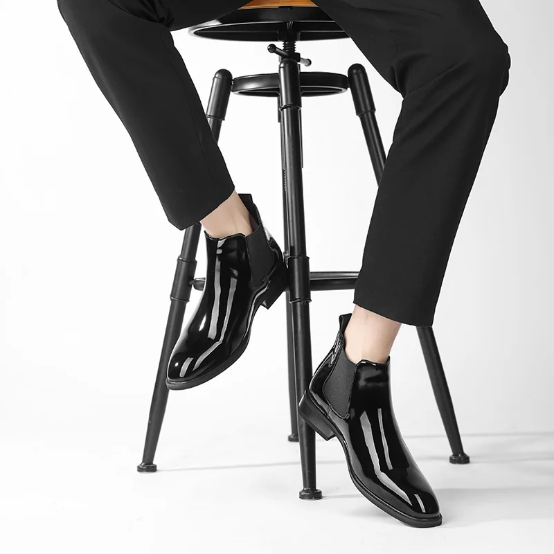 Herr Chelsea Stövlar Svarta Casual Slip on Korta Stövlar Vintage Mode Cowboy Stövlar Lackskinn Casual Glänsande Stövlar